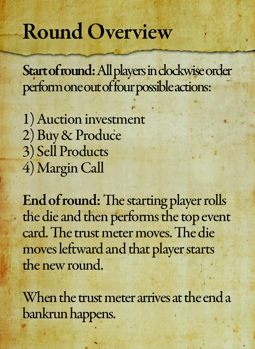 全員が銀行家としてプレイします。目標は、最も裕福な銀行家になること。信用貸付による投資で富を築きましょう。幸いなことに、投資できる信用に上限はありません。ただし運命の転変にはご用心――取り付け騒ぎが起これば、信用の返済を迫られます!